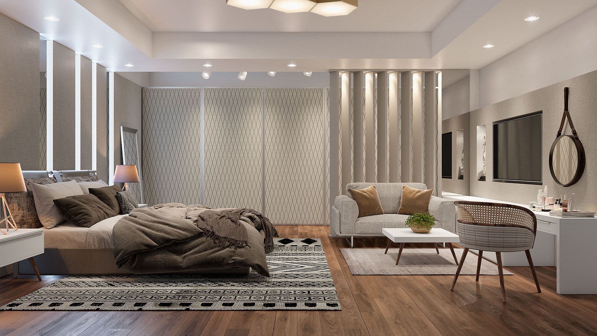Para este projeto, além das cenas fotorrealísticas, estudamos a gama de modulações e soluções da Souzanno para projetar no Promob cada composição para os 23 ambientes executados. Provando assim que a Metries é uma solução completa para a criação de qualquer peça 3D.